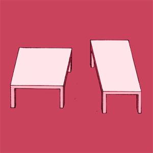 These two white shapes are identical, except that the one on the right is rotated clockwise. But even if you've measured the sides to check, you won't be able to see the shapes with the proportions they really have, as flat shapes on your screen. Our brains assume that these are tables in three dimensions. We see them with the contrasting proportions that real table-tops would have to possess, in order to project these shapes in perspective. |