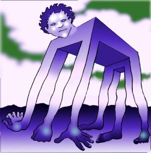 This character couldn't exist in the real world. It's not just that he has three arms and legs. In everyday vision, the edges of objects separate them from one another, like islands isolated in an ocean of space.In world of pictures, as the eye travels across the scene, the islands can transform into one another, or merge with the spaces around them, as the middle arm and leg of this figure do, flowing up into the sky. |